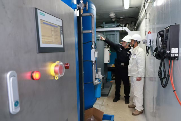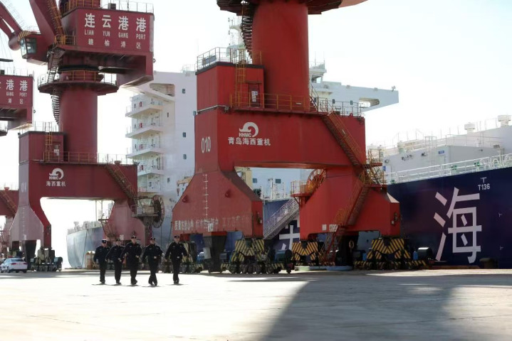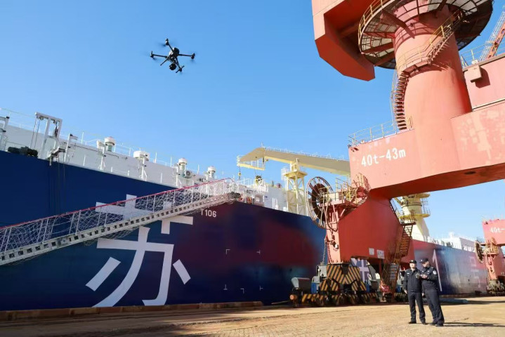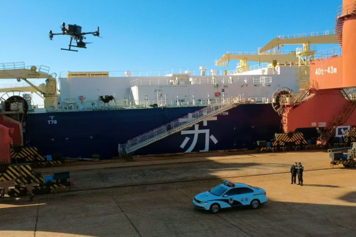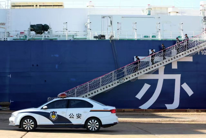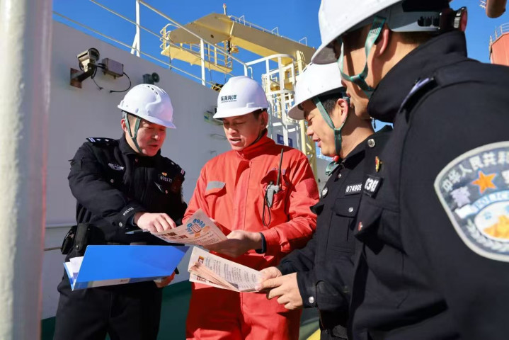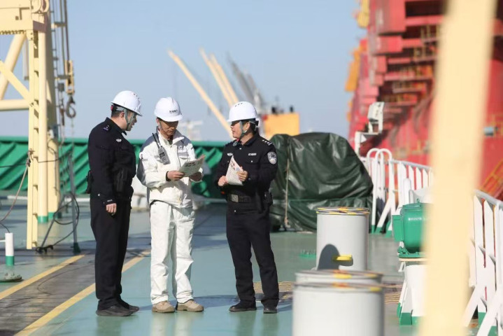 近日,全球首艘自航封闭式三文鱼养殖工船——“苏海一号”停靠连云港赣榆新海湾码头,在这里完成40万尾鱼苗投放后,将开至深海养鱼。在港期间,连云港市港航公安局赣榆港航大队民警主动靠前服务金盛网,通过人、车、无人机巡逻相结合的方式,确保船舶在港期间安全。同时,民警还主动登轮开展反诈宣传,并对安全生产措施落实情况、消防设施配备情况开展检查,督促船方安全生产。(郑永波)